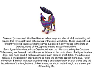 Oaxacan wood carvings are hand-carved and painted figures from the state of Oaxaca, Mexico. Artists carve the figures from copal wood using machetes and knives, then meticulously paint them with vibrant colors and detail. The whimsical figures depict animals and creatures from Zapotec mythology in poses that appear animated. Carvers draw from their own imagination and folk traditions to create the magical wood sculptures.