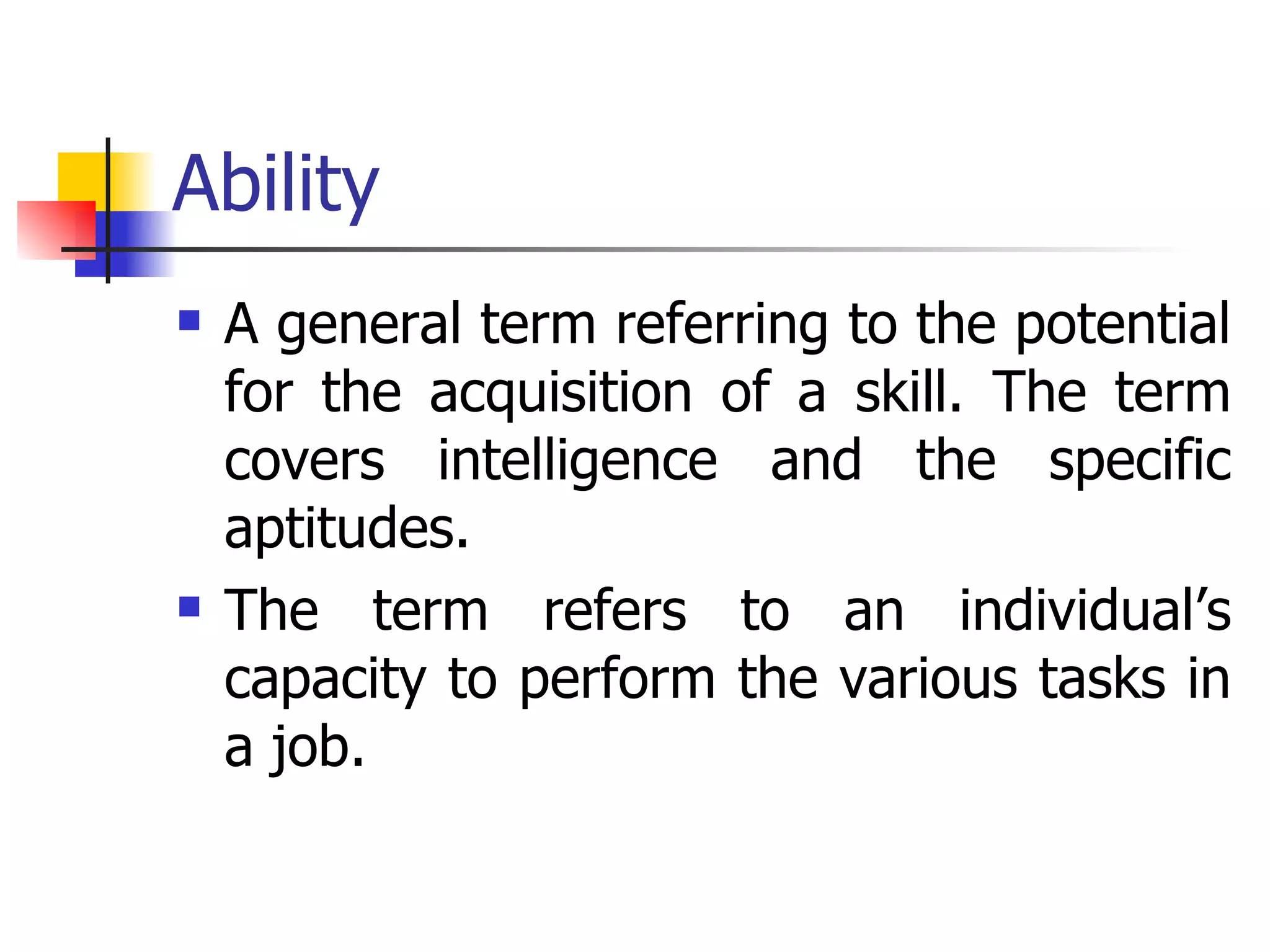 The document discusses various concepts related to ability, intelligence, aptitude, learning, and behavior modification in organizational settings. It defines key terms, describes theories of learning and intelligence, outlines biographical factors that impact work performance, and discusses reinforcement techniques and behavior modification applications in organizations. The concepts covered provide a framework for understanding individual differences and how learning and behaviors are shaped in work environments.
