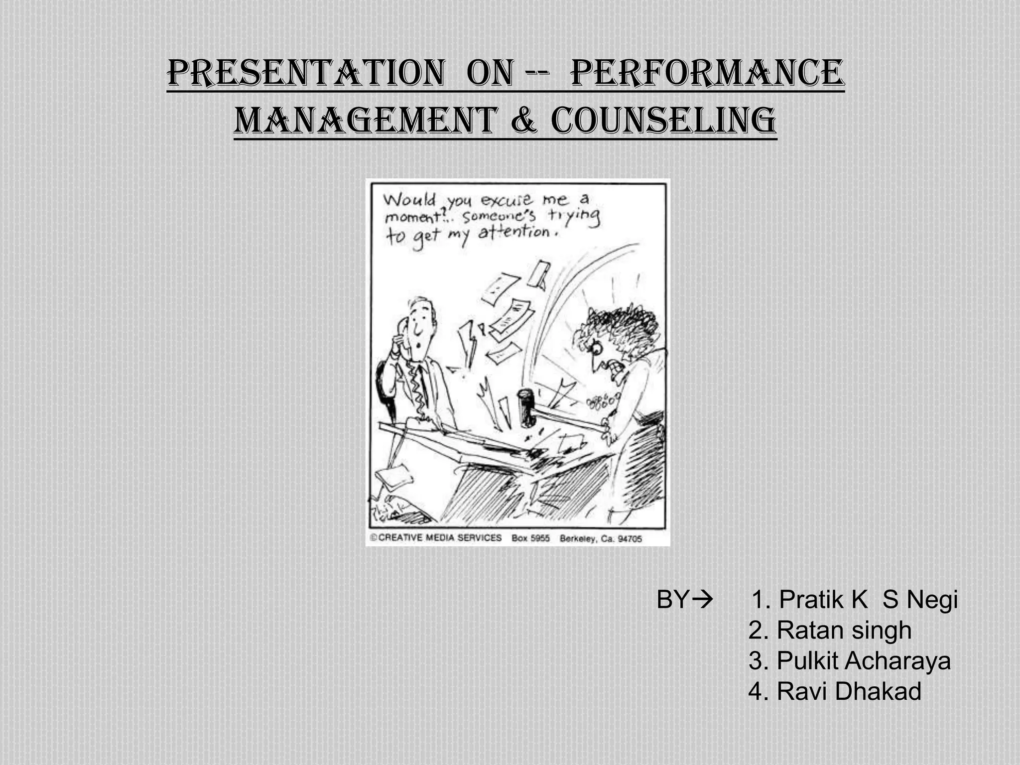 This document provides an overview of a presentation on performance management and counseling. It discusses what performance management and counseling are, why they are important, and how they can be implemented. It also discusses the benefits of performance management, the steps involved, and provides an example of how counseling can be incorporated into performance management. Finally, it discusses assessment centers and 360-degree feedback as tools for performance management and their validity, reliability, and impact.