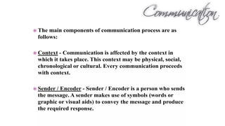 This document discusses communication, including the process, types, levels, barriers, and tools of effective communication. It defines communication as the exchange of information, ideas, thoughts, and feelings through speech, signals, writing, or behavior. The main types of communication are verbal, using words, and nonverbal, using body language and sounds. Verbal communication can be oral, such as conversations, or written, like emails. Effective communication requires understanding barriers and using tools like brevity, positivity, listening, and clarity.