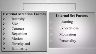 The document discusses perception processes and how individuals organize and interpret sensory information. It defines perception and outlines the perceptual process model involving environmental stimuli, receiving stimuli through the senses, and perceptual selectivity. It discusses factors like personality, motivation, experience, stimulus intensity, contrast that influence how stimuli are selected. The document also covers perceptual organization principles of figure-ground, closure, continuity, proximity and similarity. It discusses social perception and factors influencing how people perceive others. It introduces attribution theory and types of attributions like dispositional and situational. It outlines Kelley's theory of causal attribution focusing on consensus, consistency and distinctiveness. It concludes with attributional biases like the fundamental attribution error and self-serving bias.