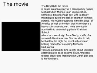 Michael Oher is a homeless and impoverished black teenage boy who has faced trauma due to lack of parental attention and substance abuse. He is admitted to a private Christian school where he meets Leigh Anne Touhy, who decides to help him by letting him stay the night but eventually helps him further. Seeing Michael's kind personality, she believes in his potential and helps him become an All-American football player and NFL draft pick through her kindness and support. The movie depicts different characters with unique styles of managing interpersonal conflicts, and how one's style depends on personality, past experiences, and role models. It also shows Michael's journey from a lack of motivation to realizing his potential and transforming his life situation.