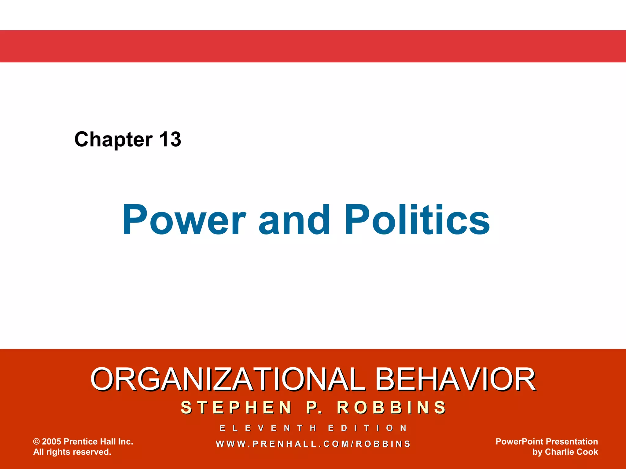 This document discusses power and politics in organizations. It defines power as the ability to influence others to act according to one's wishes. There are several bases of power, including formal power derived from one's position, and personal power stemming from expertise, charisma, or relationships. Power is translated into influence through tactics like consultation, exchange, and pressure. Coalitions are groups that temporarily unite to achieve a shared goal. The distribution of power in organizations can lead to political behaviors aimed at influencing resources and advantages.