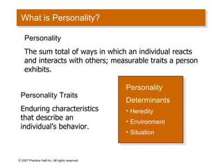 - Core self-evaluation traits like self-esteem, locus of control, narcissism, and self-monitoring that influence workplace behavior.