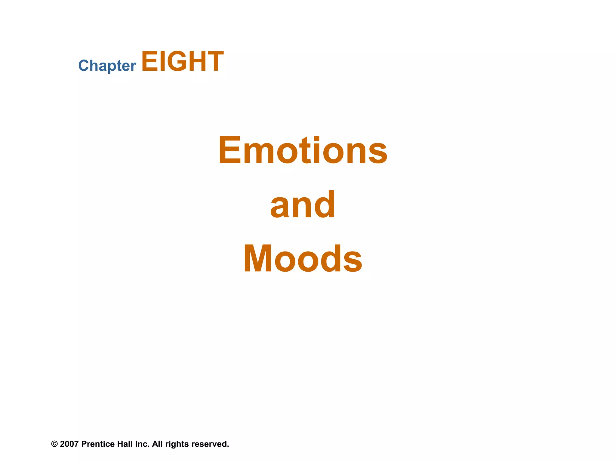 This document discusses emotions and moods in the workplace. It begins by explaining how emotions were originally ignored in organizational behavior research due to a focus on rationality. It then defines emotions, moods, and affect. The document outlines the biology, intensity, frequency, and functions of emotions. It discusses gender differences in emotional expression and constraints on emotions from organizations and culture. Several theories are explained, including affective events theory and emotional intelligence. The document closes by discussing applications of emotions and moods in areas like decision making, motivation, leadership, and job attitudes.