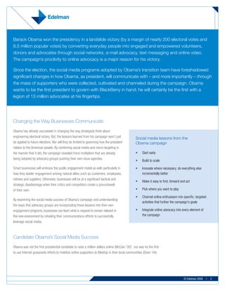 The Obama campaign was highly successful in leveraging social media to engage supporters. They integrated social media into all aspects of the campaign and did existing tools incrementally better than competitors. This included building a large online supporter base through multiple social networks and channels. Supporters were empowered to generate their own content and advocate on behalf of the campaign. By making engagement easy and providing various levels of involvement, the campaign activated a wide range of supporters in driving donations, organization, and votes. The Obama administration is now applying these social media lessons in how the president will communicate and mobilize supporters around his agenda.