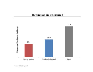 Enrollment in Obamacare exchanges exceeded expectations, with over 8 million signing up in the 2014-2015 period. The number of uninsured Americans dropped significantly as a result of the Affordable Care Act, falling from over 40 million uninsured to around 28 million. The law expanded access to health insurance and lowered the rate of uninsured Americans.