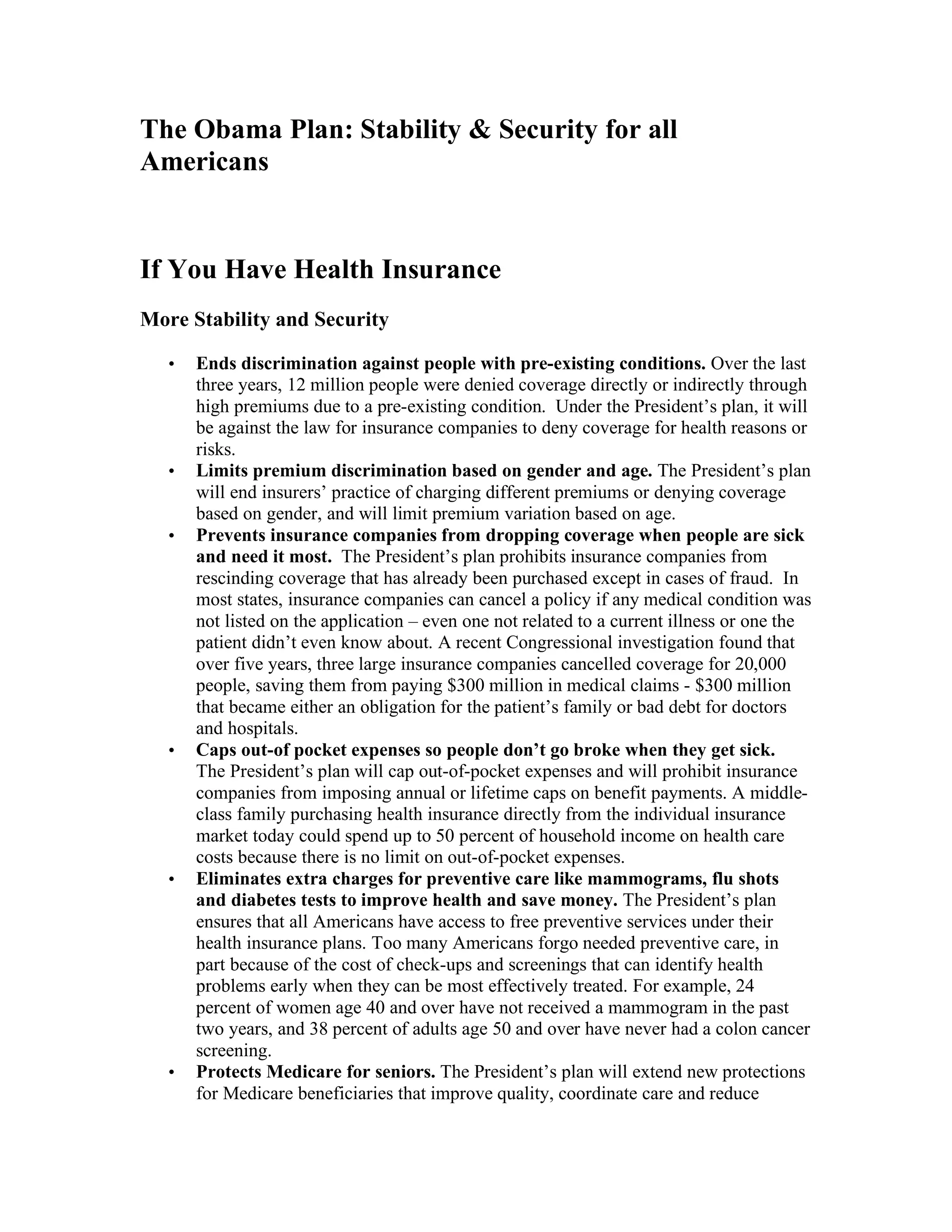 The document outlines key provisions of President Obama's health care reform plan. It proposes to: