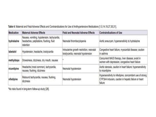 Dokumen ini membahas hipertensi, termasuk definisi, klasifikasi, dan mekanisme pengaturan tekanan darah serta berbagai obat antihipertensi. Penyakit ini memiliki dampak signifikan, terutama pada kehamilan, dengan komplikasi serius bagi ibu dan janin. Terapi farmakologis harus memperhatikan keamanan bagi ibu dan bayi, dengan beberapa obat tertentu yang dikontraindikasikan selama kehamilan.