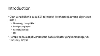 1. The document discusses drugs that act on the central nervous system (CNS), which consists of the brain and spinal cord. Many CNS drugs work by affecting neurotransmitter receptors that influence signal transmission.