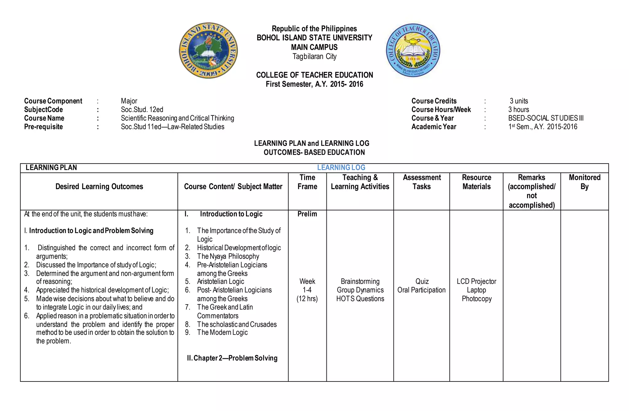 This document outlines the learning plan for a course on Scientific Reasoning and Critical Thinking. Over the course of 18 weeks, students will study logic, problem solving, fallacies, and syllogisms. They will learn to distinguish correct from incorrect arguments, appreciate the history of logic, and apply reason to problematic situations. Assessment will include exams, projects, class participation, and reflections. The goal is for students to develop skills in scientific reasoning, critical thinking, and identifying formal and informal fallacies.