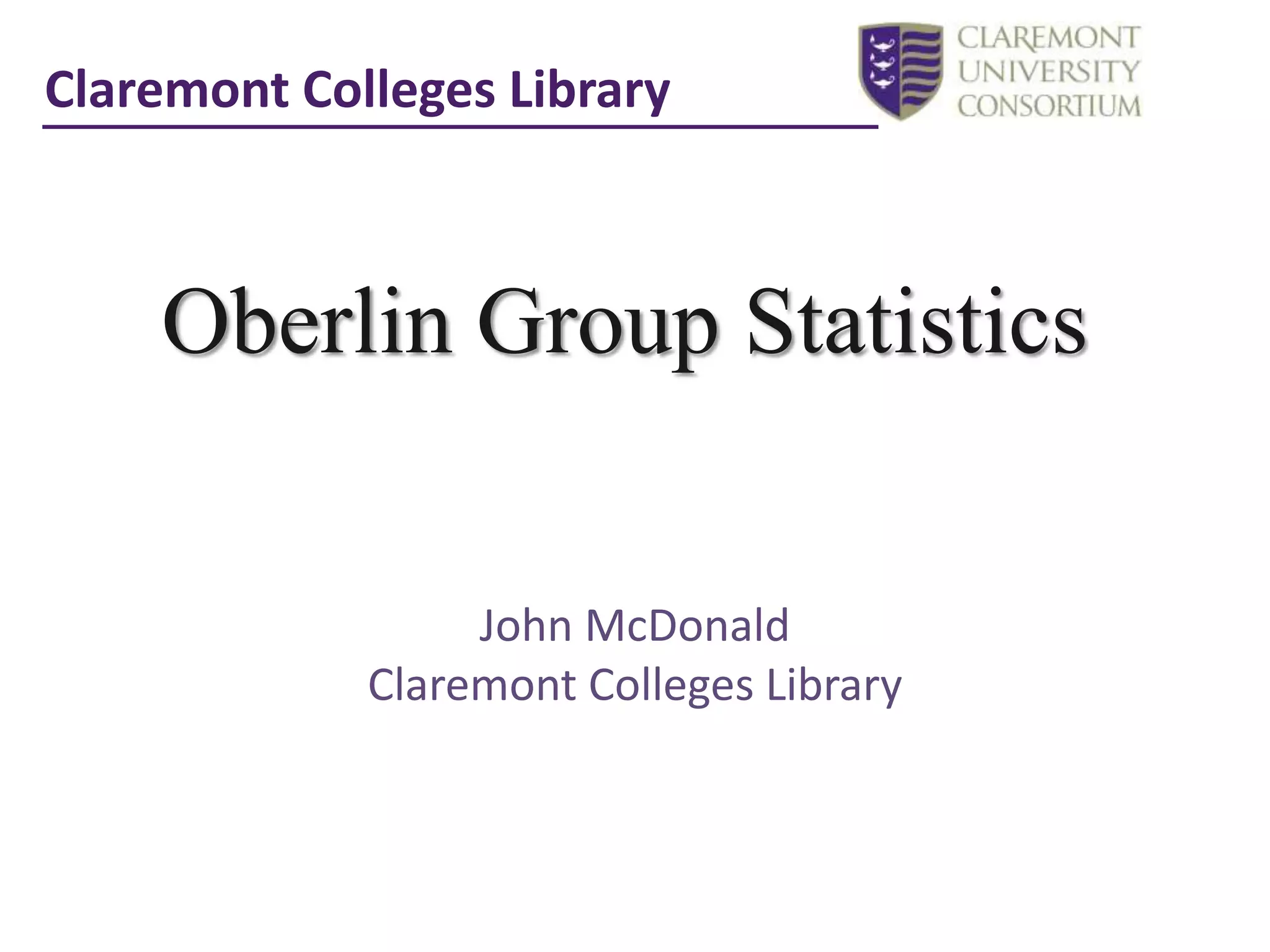 This document discusses analyzing 6 years of statistics from the Oberlin Group of liberal arts colleges. It describes transforming the data, checking for outliers, testing correlations between variables, and building a regression model. It finds that high group attendance impacts reference transactions but not circulation. High gate count results in high circulation. Circulation depends on volume count. The document also explores predicting US News rankings based on library-specific data like expenditures, staff salaries, collections, and transactions.