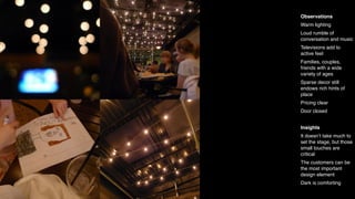 The document describes observations and insights from four different retail stores. The first store had dim lighting, no music, small seating and constant movement with families shopping together. The second store was louder with music and conversation, families and groups of different ages shopping, and pricing clearly visible. The third store had quiet music, central waiting area, black interior design and no visible pricing. The last store had harsh lighting, shoppers mostly alone with security visible, bright colors and styles everywhere with pricing clearly visible.