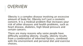 Obesity is a complex medical condition characterized by excessive body fat that increases the risk of diseases such as heart disease, diabetes, and certain cancers, often caused by a combination of genetic, lifestyle, and environmental factors. Diagnosis is generally made using the Body Mass Index (BMI), and treatment options include dietary changes, physical activity, prescription medications, and surgical procedures. Preventative measures involve regular exercise, a healthy diet, and monitoring weight to avoid unhealthy weight gain.