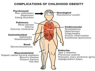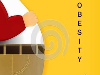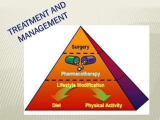 Obesity is defined as abnormal growth of adipose tissue due to enlargement of fat cells or increase in fat cell number. Central obesity is measured by waist circumference. Obesity is classified based on BMI and is associated with increased risk of comorbidities like diabetes, hypertension and dyslipidemia. It is caused by factors like unhealthy diet, physical inactivity, genetics and hormones. Treatment involves moderate calorie restriction and physical activity. Homoeopathic medicines like Calcarea carb, Natrum mur, Ammonium carb and Ferrum met can help in obesity management.