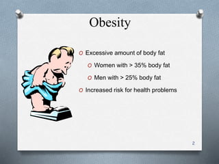 This document discusses obesity as the disease of the 21st century. It describes regional fat distribution patterns and their health risks, and explores the pathophysiology of obesity, including components of energy expenditure, the roles of brain neurotransmitters and hormones in regulating body weight. Finally, it examines current anti-obesity drugs like Orlistat, Sibutramine, and Phentermine that work by reducing nutrient absorption, inhibiting neurotransmitter reuptake, or stimulating norepinephrine release respectively, and considers future perspectives for obesity treatment.