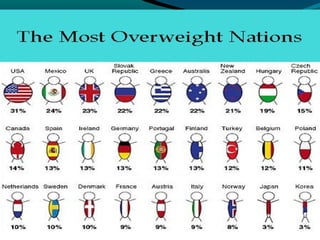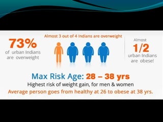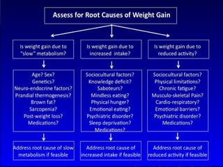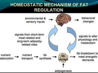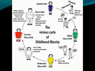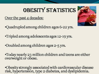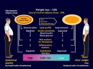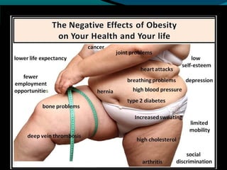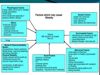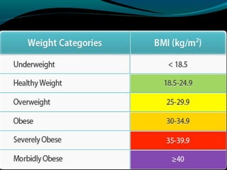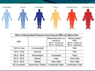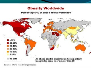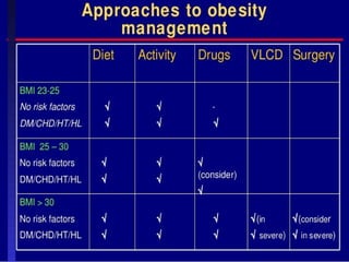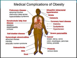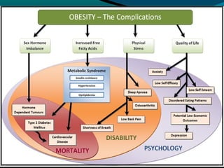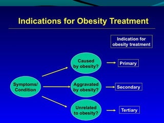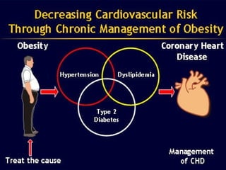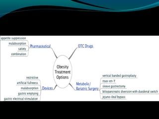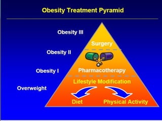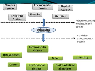 Obesity is a chronic disease characterized by excessive body fat accumulation that exceeds ideal body weight by 20%. It is caused by an imbalance between caloric intake and energy expenditure influenced by genetic, environmental, and social factors. Obesity management requires a long-term, flexible approach that may include dietary changes, lifestyle modifications, physical activity, drug therapy, and surgery, with the goal of modest and sustained weight loss of 5-10% to improve health outcomes rather than focus on achieving an ideal weight.