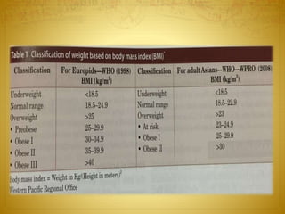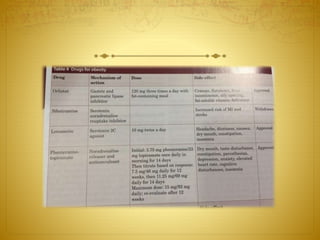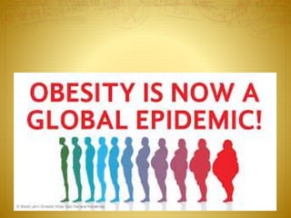 The document discusses obesity, including its prevalence, complications, and treatment. Some key points: