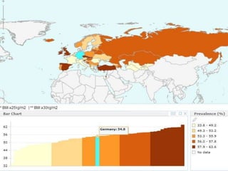 The document discusses obesity in Germany. It notes that over half of Germans are overweight and about 1 in 6 are obese. Obesity rates have doubled since 1980. The German government has launched initiatives to reduce obesity rates by 2020, including education programs on nutrition and exercise in schools, improved food labeling, and limiting junk food marketing to children. Obesity is linked to increased risk of diseases like diabetes, cancer, and heart disease. The health and economic impacts of obesity in Germany are substantial.