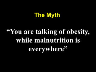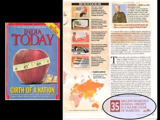 This document discusses obesity in India from the perspective of experts Dr. Anoop Misra and Dr. Seema Gulati. It presents data showing rising rates of overweight and obesity among Indian adolescents. It dispels common myths about obesity, noting that excess weight in childhood often leads to health issues like diabetes and heart disease. While obesity was once seen as a problem only of developed nations, the data shows its growing prevalence in India and other developing areas. The experts attribute this to unhealthy diets high in processed foods and low physical activity levels among Indian youth. They call for initiatives to increase awareness about obesity prevention and healthy lifestyles.