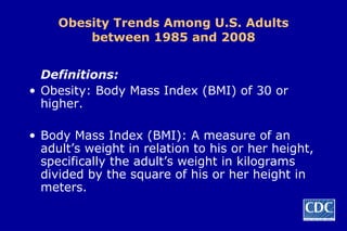 This document examines trends in obesity among US adults between 1985 and 2008 based on data from the Behavioral Risk Factor Surveillance System. It shows that between 1990 and 1999, the number of states with obesity prevalence over 10% increased, and between 1999 and 2008, nearly all states had obesity prevalence over 20% with many over 30%. The increasing prevalence of obesity across US states over this time period demonstrates the worsening of the obesity epidemic.