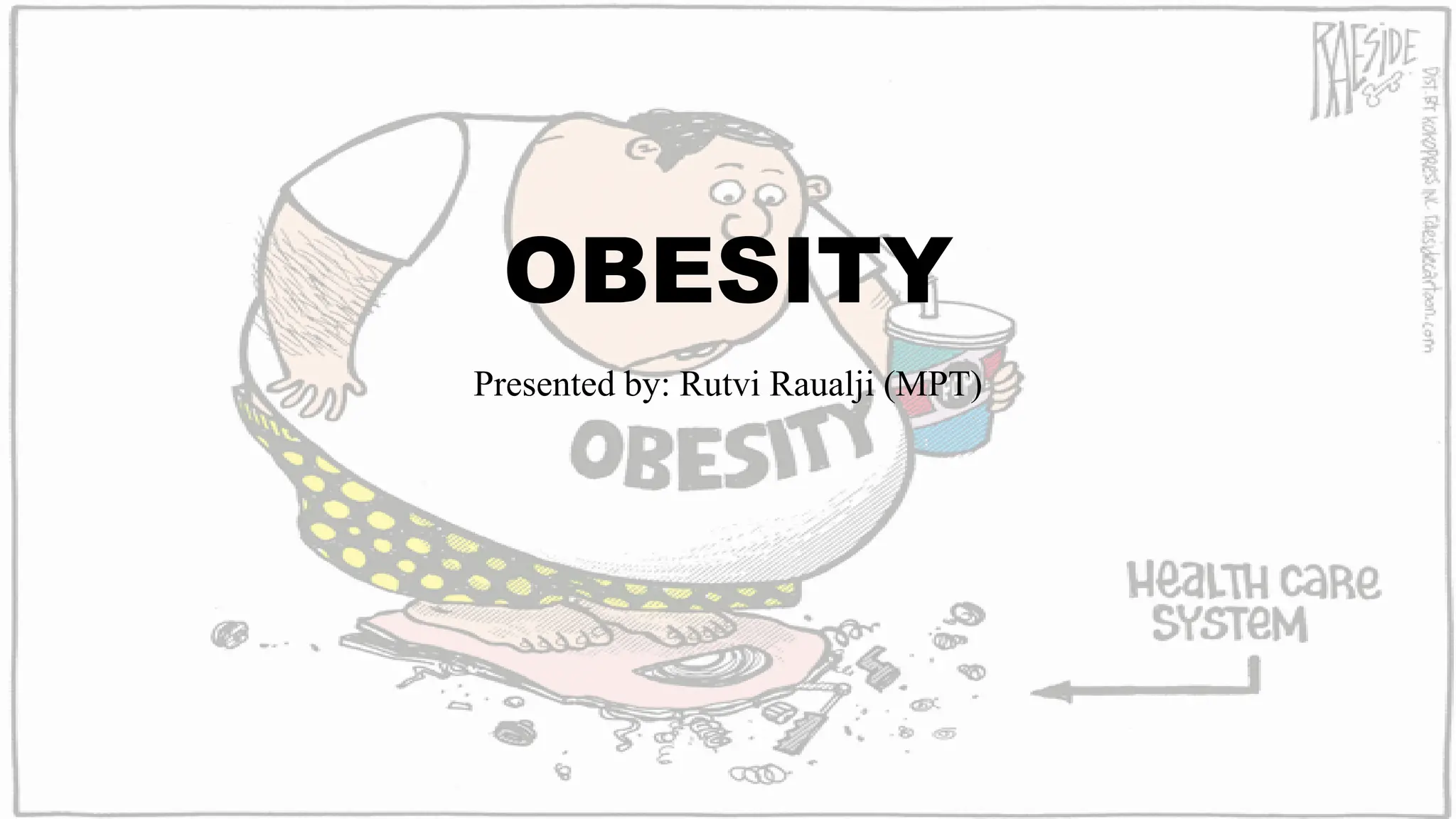 The document discusses obesity as a complex global epidemic affecting 1.9 billion overweight individuals, with 600 million classified as obese. It examines contributing factors such as dietary patterns, genetics, and physical inactivity, along with the serious comorbidities linked to obesity like cardiovascular disease and diabetes. The document also outlines assessment techniques, medical and surgical management options, and the importance of education, dietary changes, and exercise in obesity treatment.