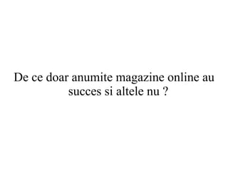 Documentul discută strategiile esențiale pentru succesul magazinelor online, subliniind importanța transparenței și a încrederii, prin furnizarea informațiilor de contact și a detalii despre produse. Se recomandă publicarea feedback-ului clientului și utilizarea de elemente distincte care să asigure credibilitatea, cum ar fi sigiliile de încredere. De asemenea, subliniază necesitatea unui site ergonomic și ușor de utilizat pentru a optimiza experiența de cumpărare.