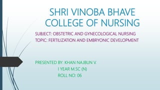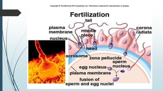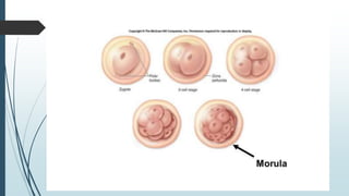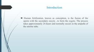 The document summarizes the key stages of fertilization and embryonic development in humans. It describes: