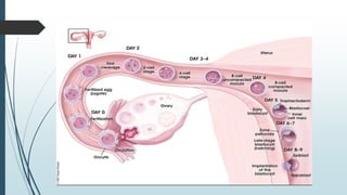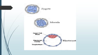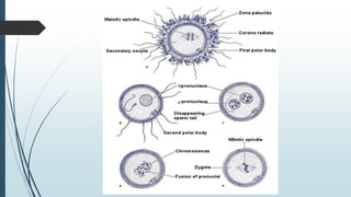 1) Fertilization occurring when the sperm fuses with the ovum in the fallopian tube to form a zygote, which undergoes cell division over several days to become a morula and then a blastocyst.