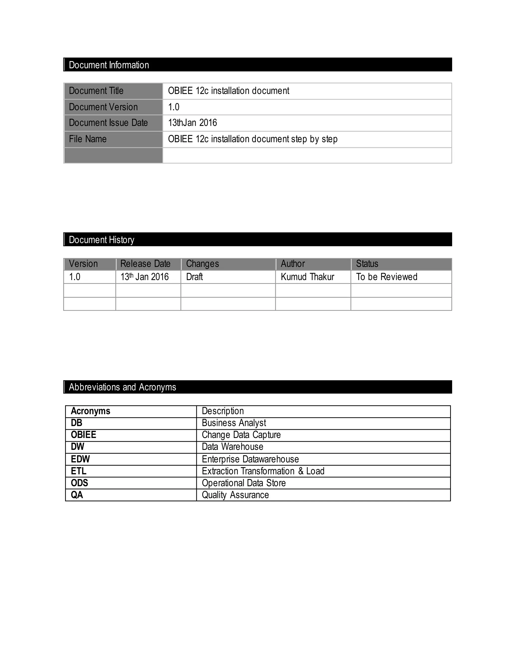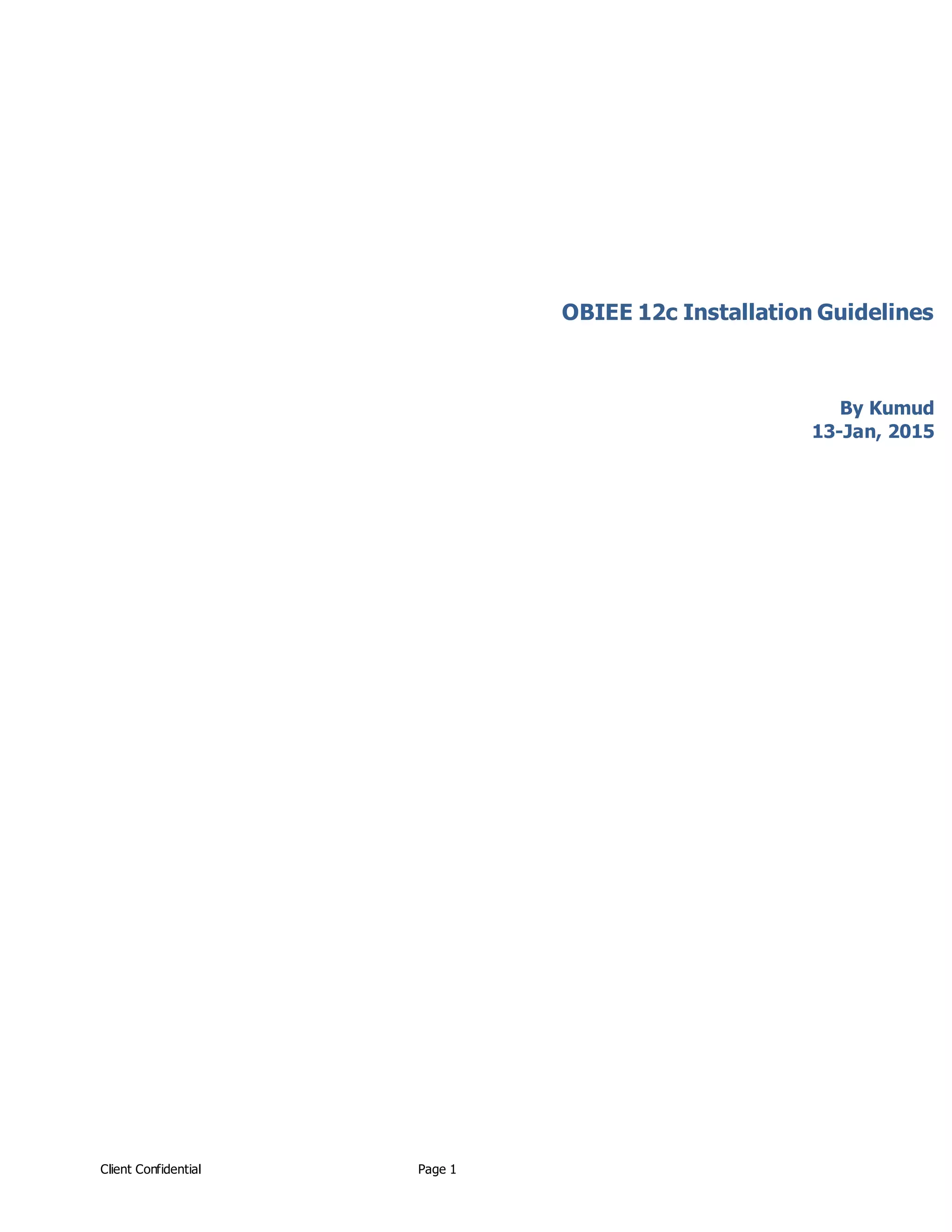 The document provides guidelines for installing OBIEE 12c including prerequisites, infrastructure setup, installing the BI platform, and configuring the RCU and BI application. It outlines 16 steps for setting up the required infrastructure by installing Fusion Middleware 12c, downloading and extracting the BI platform files, and running the configuration wizard. The document also includes 4 steps for configuring RCU and 11 steps for configuring the OBIEE application.