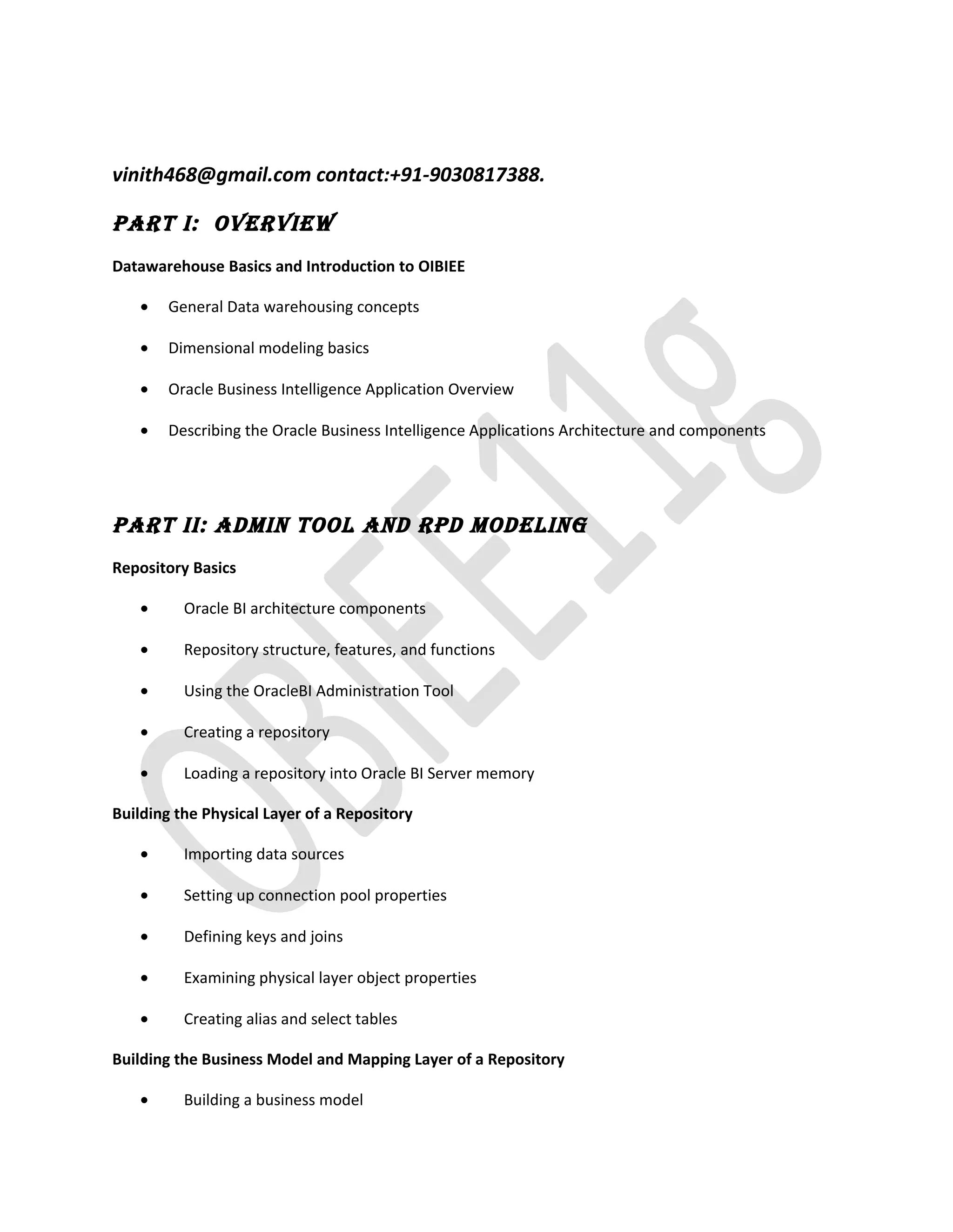This document provides an overview and outline for a training course on Oracle Business Intelligence (OBIEE). The course covers topics such as data warehousing concepts, dimensional modeling, OBIEE architecture, repository modeling using the Administration Tool, building dashboards and analyses in Oracle Business Intelligence Answers, security features, caching, and real-time business scenarios. The course is divided into four parts that cover repository modeling, dashboard and analysis, security features and delivery, and important real-time scenarios.