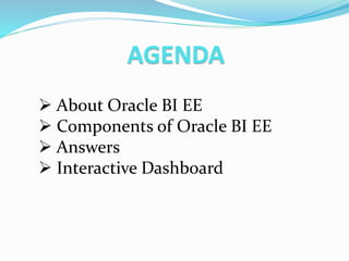 The document provides an overview of Oracle BI EE (Business Intelligence Enterprise Edition), including its components, advantages, and architecture. It describes Oracle BI EE as an analytical tool that helps users view and analyze data to gain insights. The key components of Oracle BI EE are the Oracle BI Client, Presentation Services, Server, Repository, and Answers. It also discusses interactive dashboards, report parameters, and best practices for Oracle BI EE.