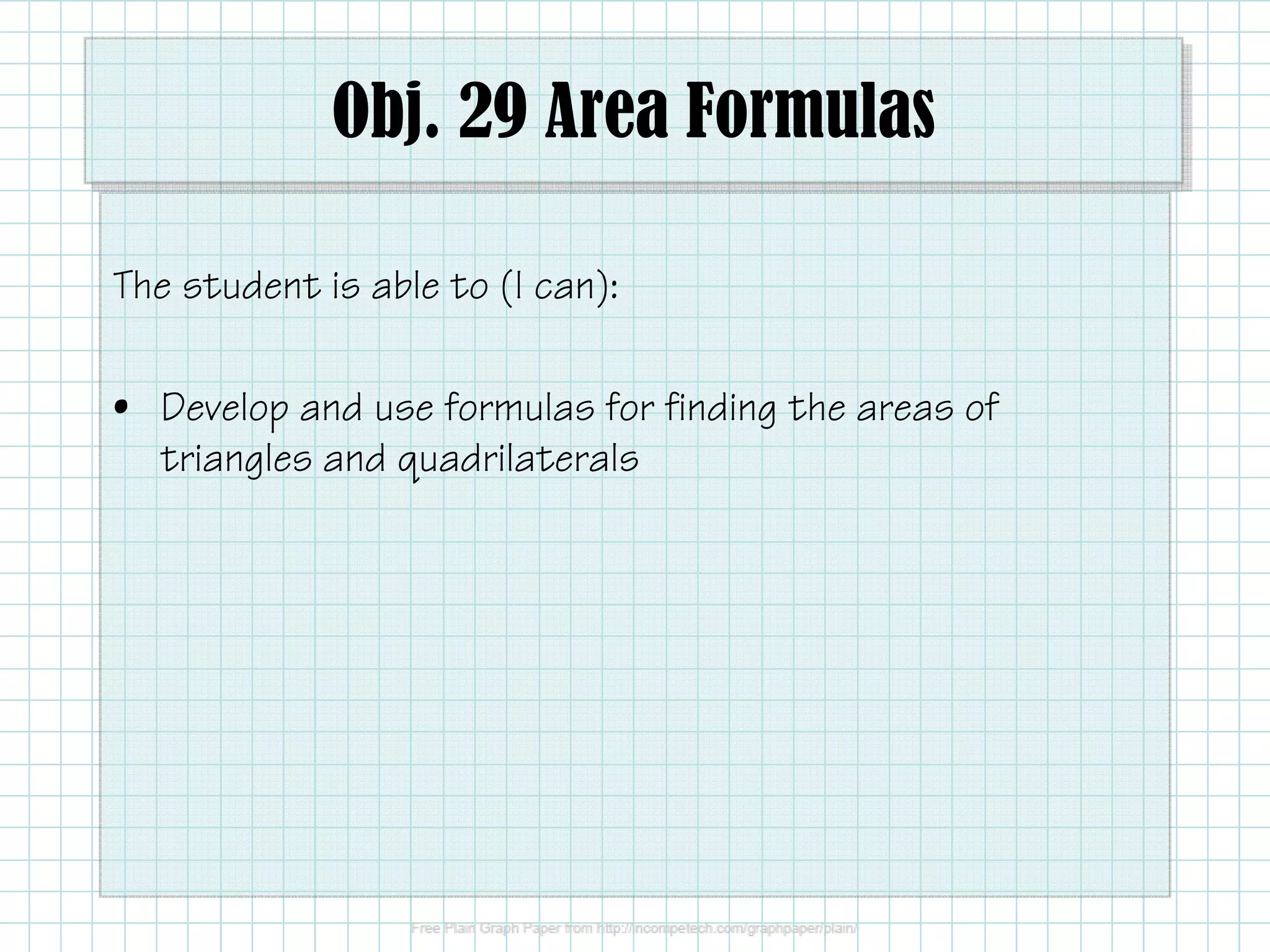 The document discusses formulas for calculating the areas of various shapes including triangles, quadrilaterals, parallelograms, trapezoids, rhombi, squares, and kites. It provides the area formulas, explains how to derive the formulas for parallelograms, triangles, and trapezoids from rectangles, and includes examples of using the formulas to calculate heights and areas.