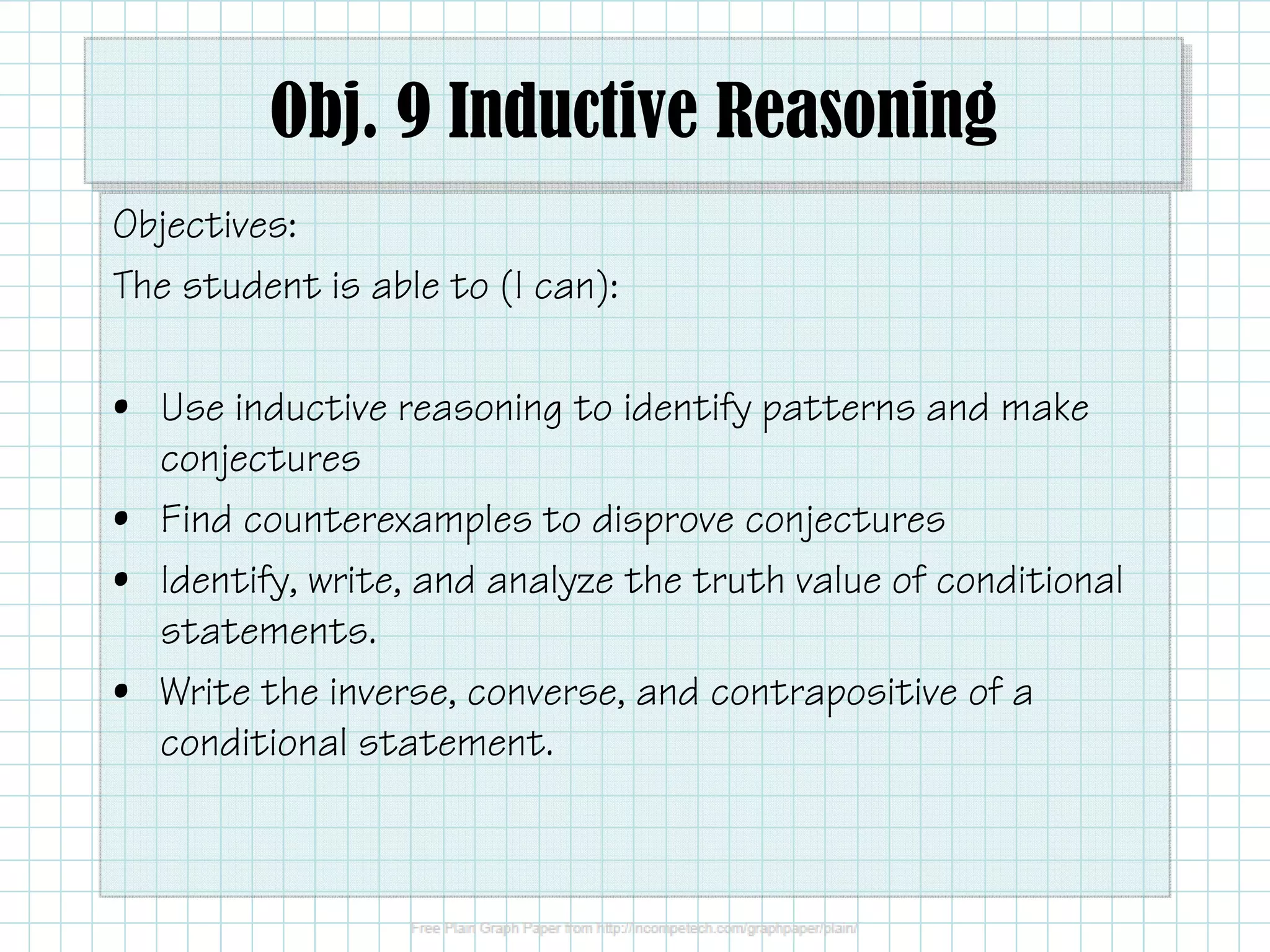 The document outlines objectives related to inductive reasoning, including identifying patterns, making conjectures, and analyzing conditional statements. It emphasizes the importance of counterexamples in disproving conjectures and provides examples of sequences, conditional statements, and truth values. Lastly, it discusses the concepts of converses, inverses, and contrapositives of statements, along with their truth values.