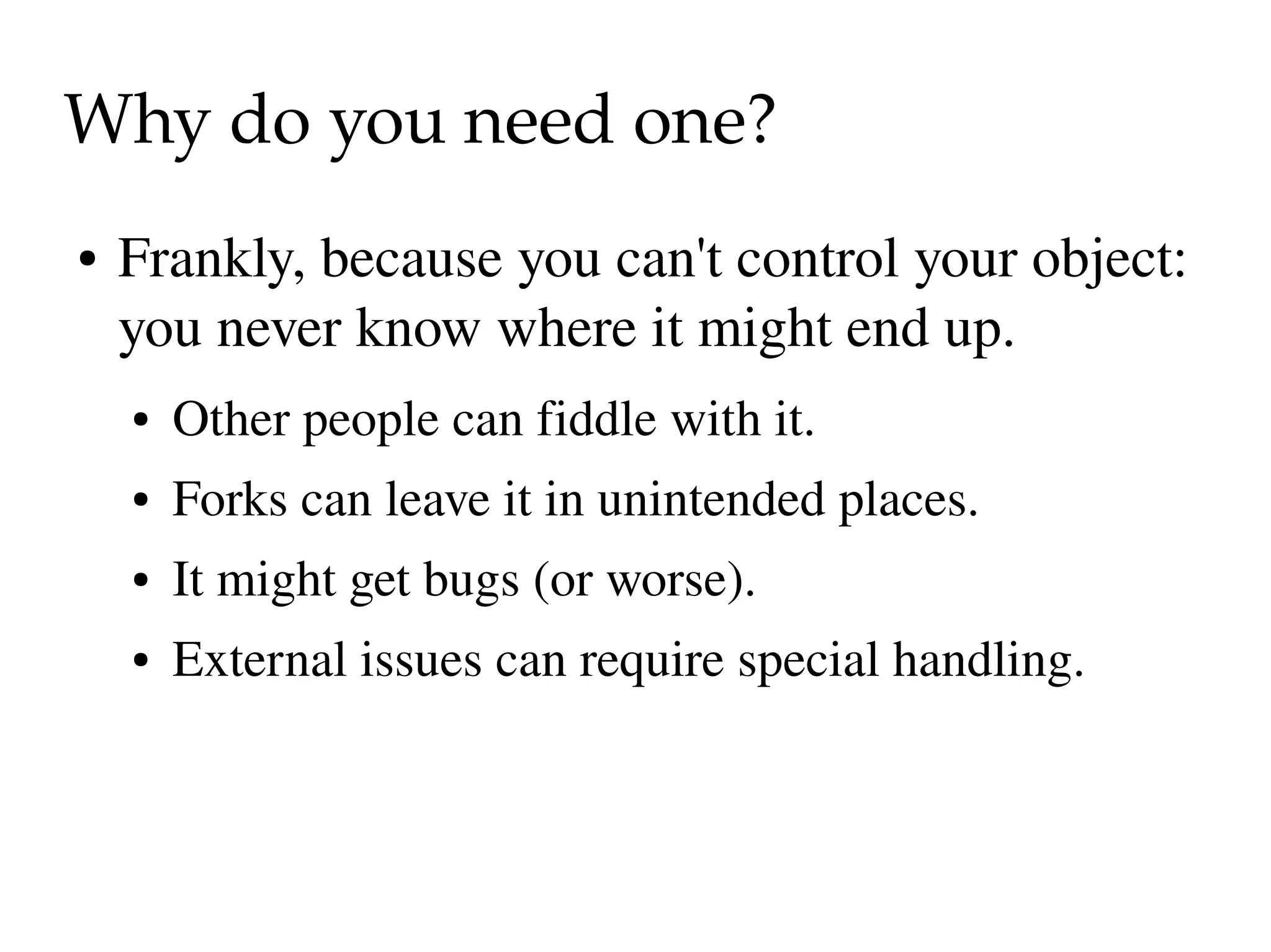 The document discusses the concept of 'frangers' and their importance in object-oriented programming, particularly in handling database interactions with forks in Perl. It outlines the need for wrappers to manage special cases, ensure reusability, and maintain clean object state across processes. The text provides technical details on constructing, managing, and cleaning up these wrappers to avoid issues such as cross-fork contamination and memory leaks.