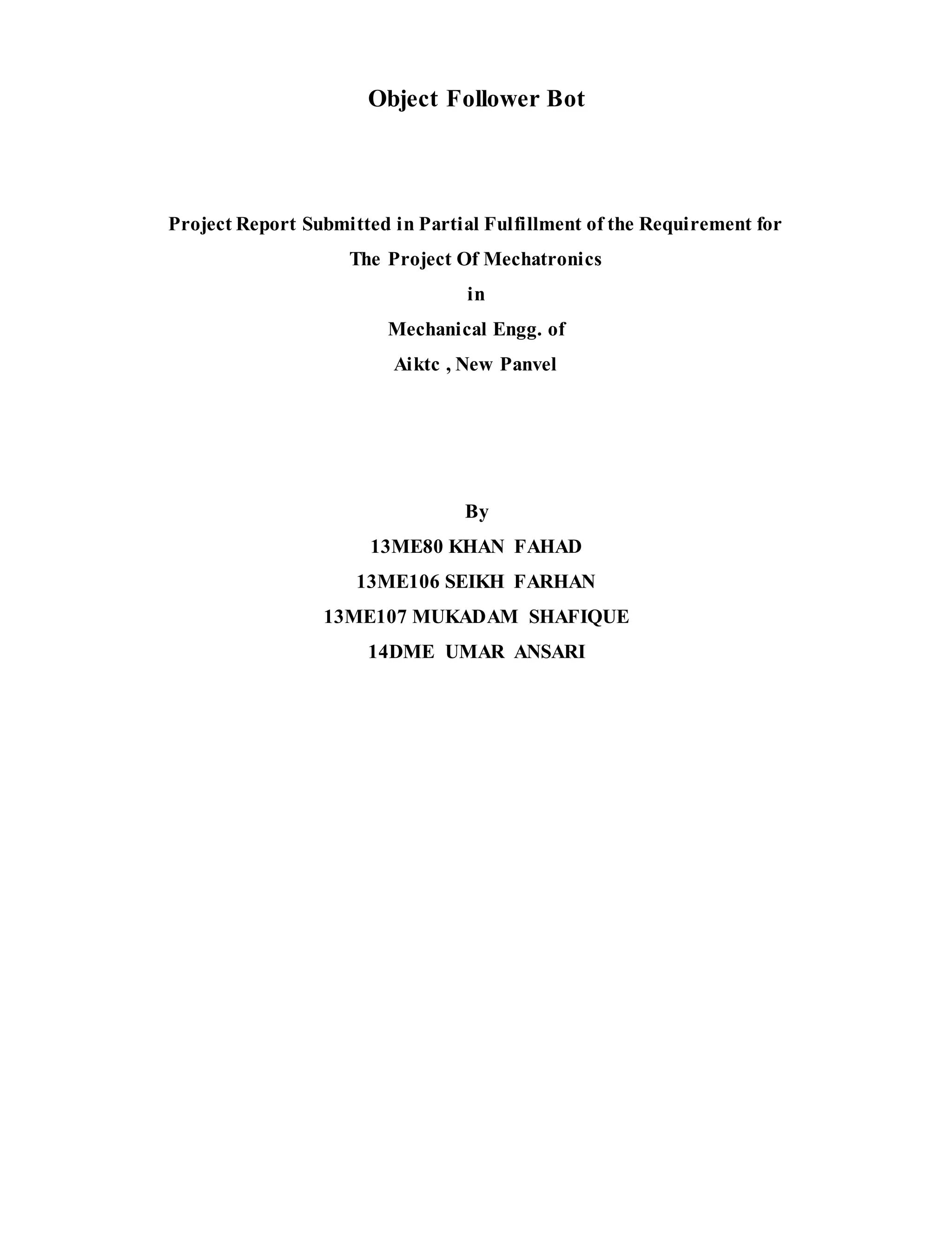The document describes an object follower robot project created by four students. The robot uses infrared sensors and a microcontroller to detect and avoid obstacles. It has two motors connected to an L293D driver IC to control movement. The project involves designing printed circuit boards for the sensor and controller circuits and integrating the components. The robot is able to autonomously navigate an area while following and avoiding objects.