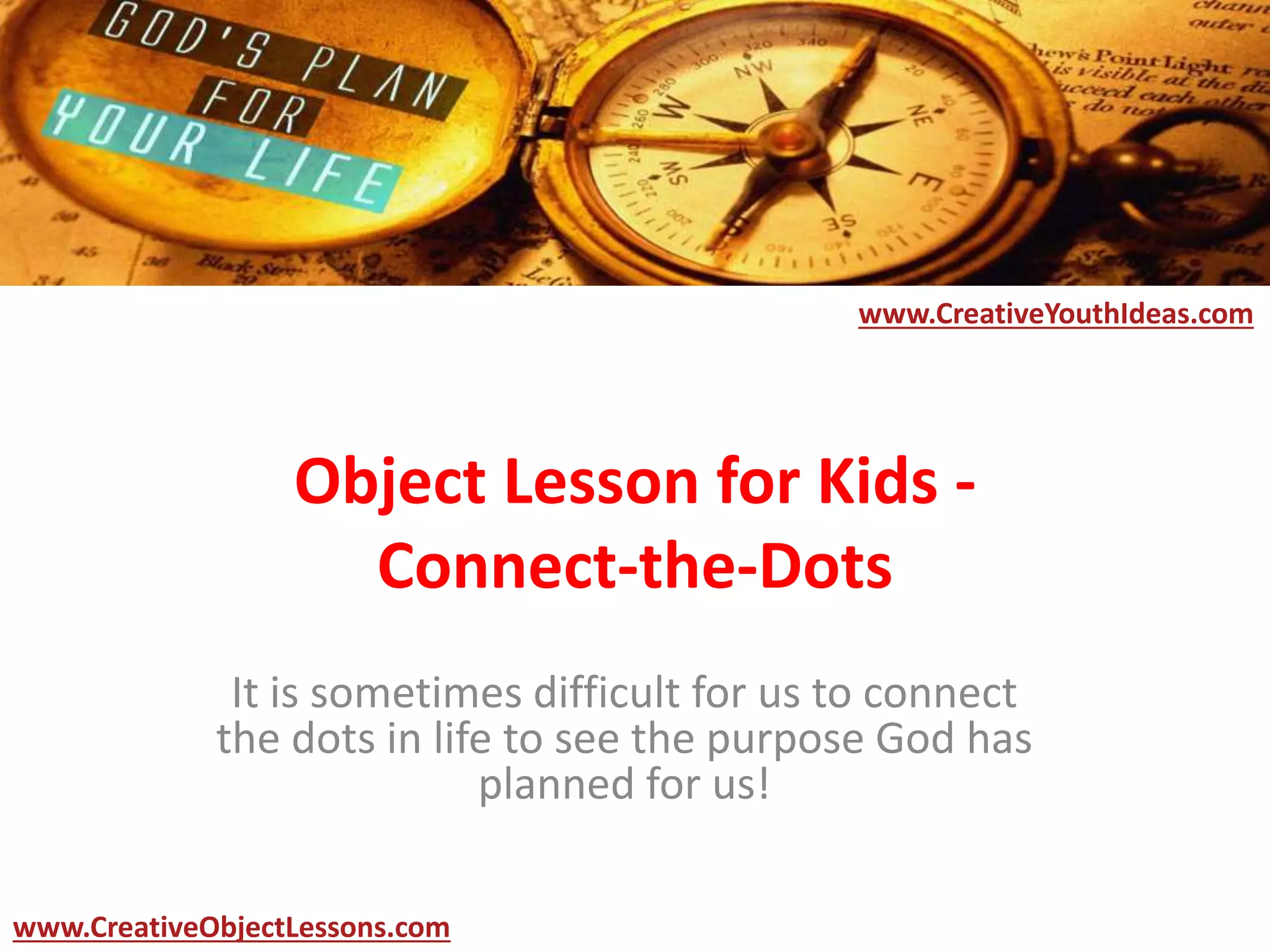The document presents a connect-the-dots activity as an analogy for faith, illustrating that just as one must trust the process to reveal the final picture, individuals must also trust in God's plan despite not seeing the complete picture. It encourages discussion on trust in God's design, doubts experienced in faith, and the importance of following the planned steps in life. The document offers guidance for engaging youth in discussions about faith through the connect-the-dots concept.