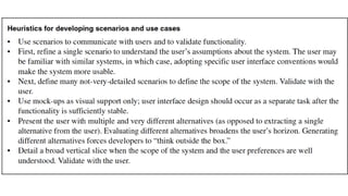 The document covers essential concepts and methods of object-oriented analysis and requirements elicitation in software engineering, emphasizing the identification of actors, use cases, and nonfunctional requirements. It discusses various analysis activities, such as mapping use cases to objects, refining requirements, and managing traceability. Essential references and a structured approach are outlined for successfully documenting and managing requirements within software projects.