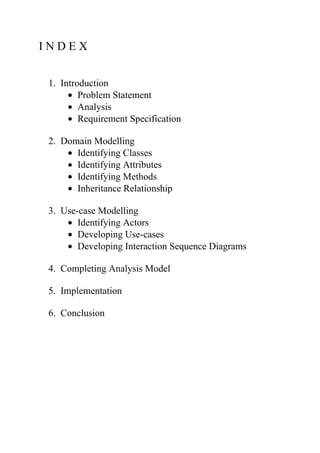 This document presents a case study report on developing a hotel management system. It outlines the problem statement of moving from a manual paper-based system to an automated one. It then describes analyzing the requirements and identifying classes, attributes, methods, and relationships through domain modeling. Use cases are developed by identifying actors and their interactions. Finally, the analysis model is completed with class diagrams and interaction sequences. The goal is to implement a software system to improve processes like reservations, billing, and resource allocation.