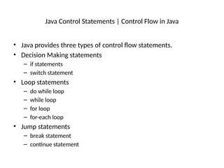 • Java provides three types of control flow statements.