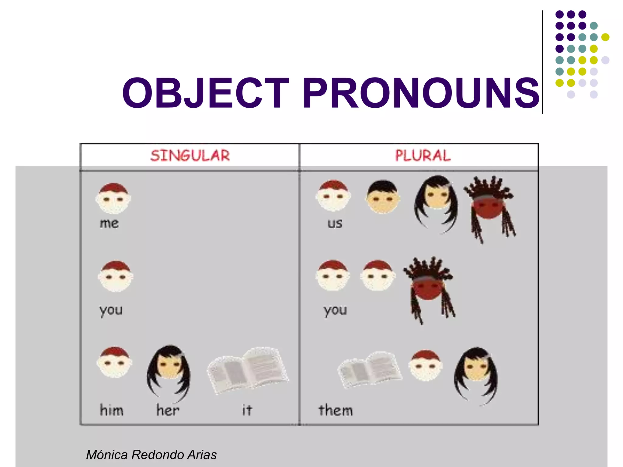 This document discusses subject and object pronouns in English. It explains that subject pronouns like I, you, he, etc. come before verbs, while object pronouns like me, you, him, etc. come after verbs or prepositions. Some examples are provided to illustrate the difference. The document also includes practice exercises for readers to identify subject and object pronouns in sentences. Readers are encouraged to do more practice in the class blog.