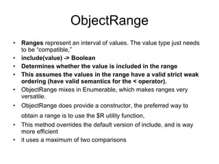 ![ObjectRange Examples; 1)$A($R( 1 , 5 )).join( ', ' ) // -> '1, 2, 3, 4, 5' 2) 2) $R( 1 , 5 ).zip([ 'one' , 'two' , 'three' , 'four' , 'five' ], function (tuple) { return tuple.join( ' = ' ); }) // > ['1 = one', '2 = two', '3 = three', '4 = four', '5 = five'] 3)$A($R( 'a' , 'e' )) // -> ['a', 'b', 'c', 'd', 'e'], no surprise there](https://image.slidesharecdn.com/object-range-1225166610728971-9/85/Object-Range-3-320.jpg)