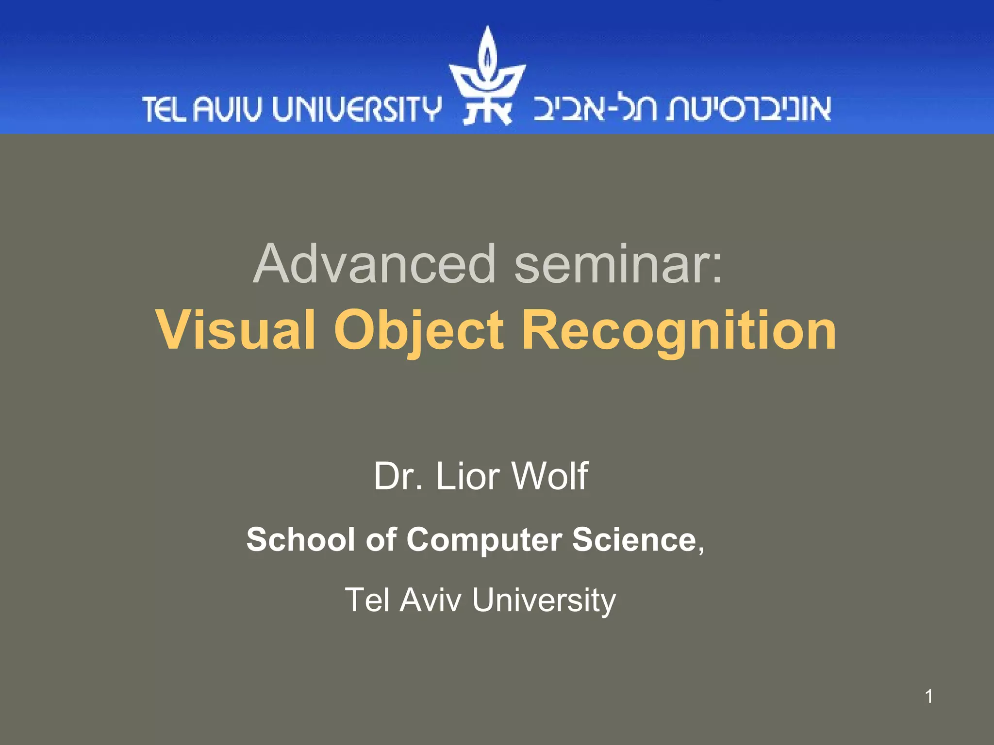 This document provides an overview of an advanced seminar on visual object recognition. The seminar will be held on Mondays from 1-3pm in room 106 of the Dan David classrooms at Tel Aviv University, lasting 13 weeks. Grading will be based on a class presentation or project (80%) and class participation (20%). The seminar will cover topics like street scene understanding, face detection, image categorization, and pose estimation. It will also discuss challenges in visual object recognition like viewpoint variation, illumination changes, occlusion, scale changes, and intra-class variation.