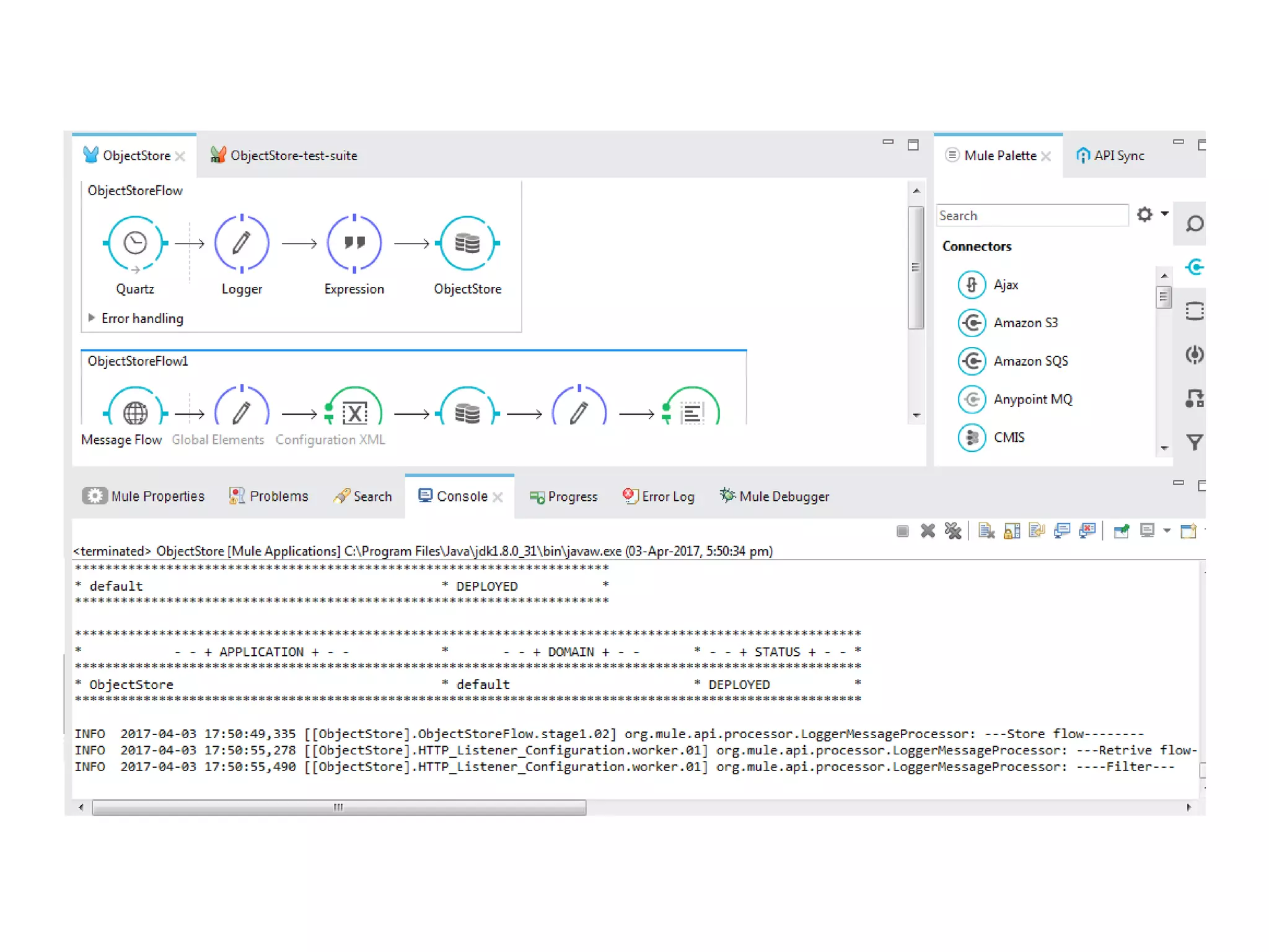This document provides an example of how to use the Object Store Connector in Mule to store and retrieve data. It shows storing a Map containing key-value pairs in the object store using the <objectstore:store> element. It then retrieves the stored data using the <objectstore:retrieve> element and sets it as the payload to log and return the value.