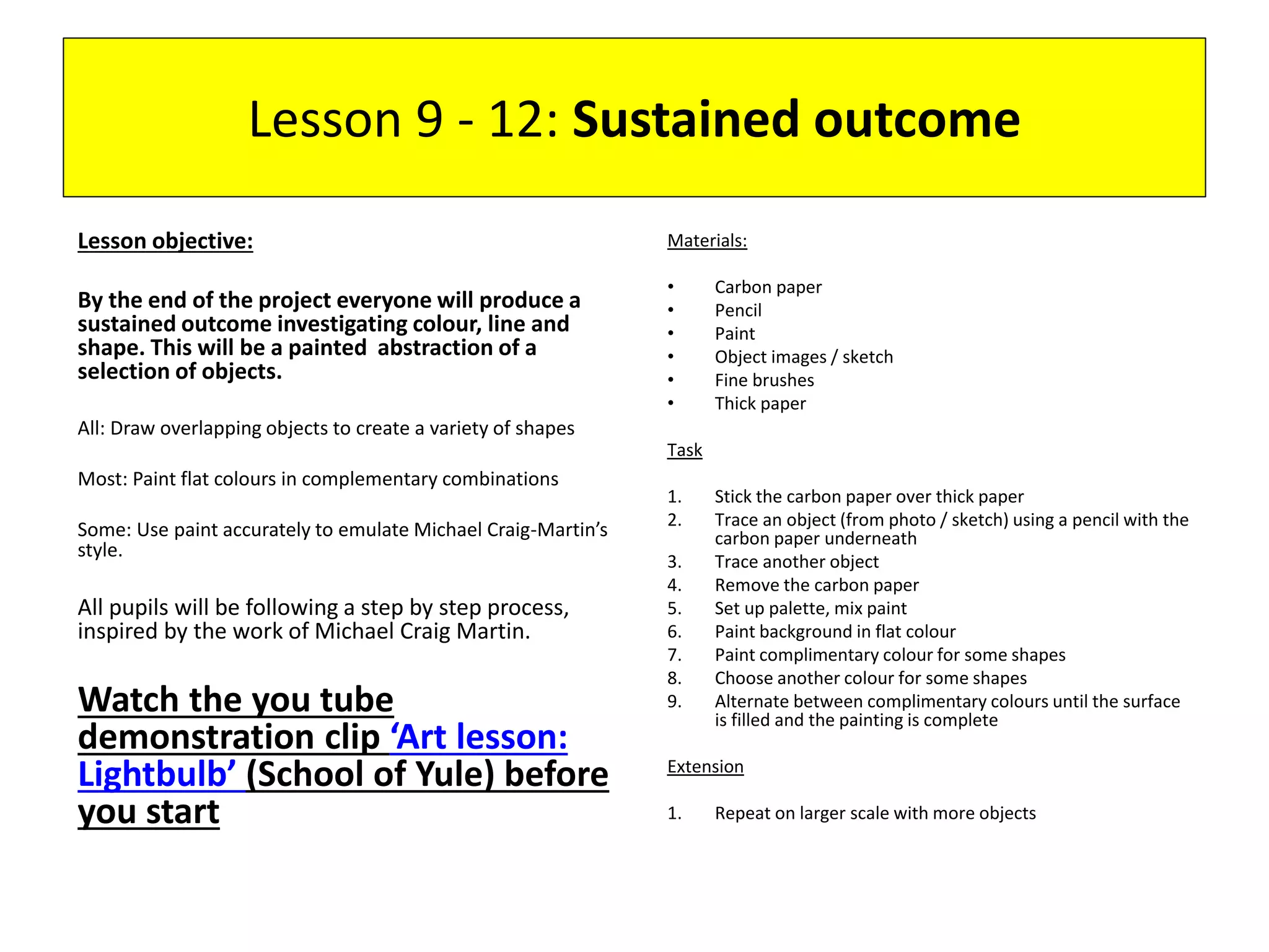 The lesson objective is for students to produce a sustained outcome investigating color, line and shape by painting an abstract representation of selected objects. Most students will paint flat complementary colors while some emulate Michael Craig-Martin's style. All students will follow steps inspired by his work, starting with tracing objects with carbon paper onto thick paper before filling the surface with alternating complimentary colors until complete.