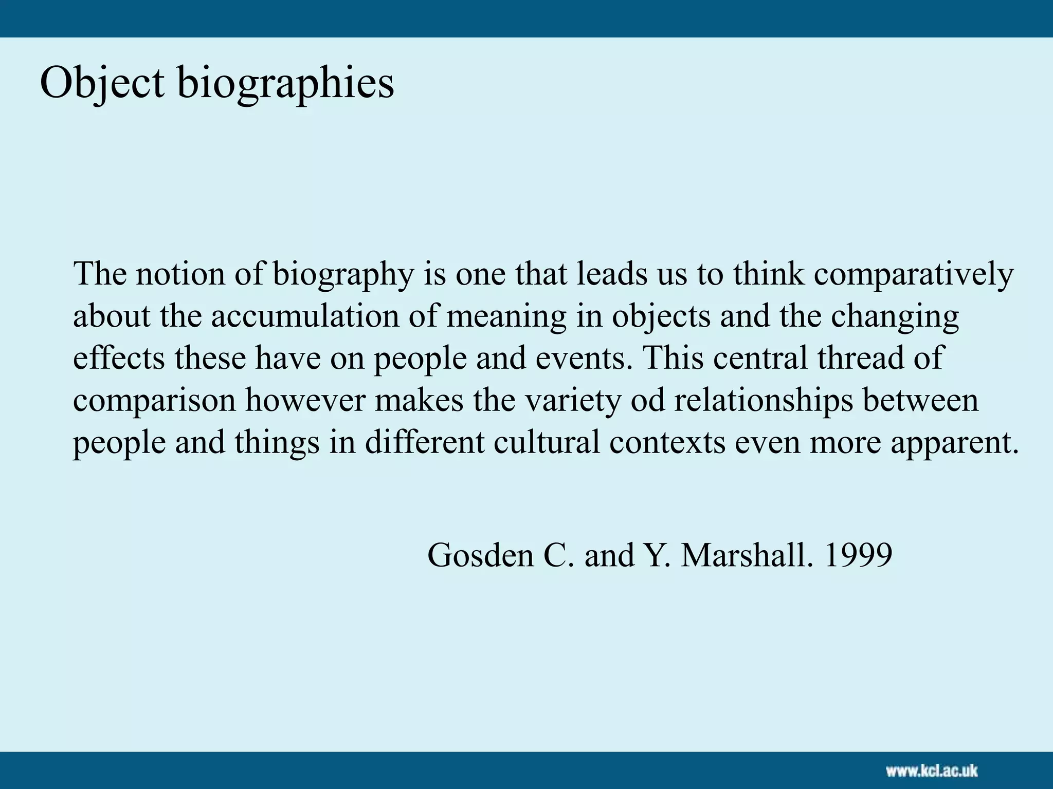 The document explores the concept of object biographies, emphasizing the comparative accumulation of meaning in objects and their changing significance across different cultures. It highlights the 'life history' approach and the distinction between static and movable objects, suggesting that object biography enhances understanding of relationships between people and artifacts. Additionally, it underscores the importance of imagery and digital publication in conveying these narratives.