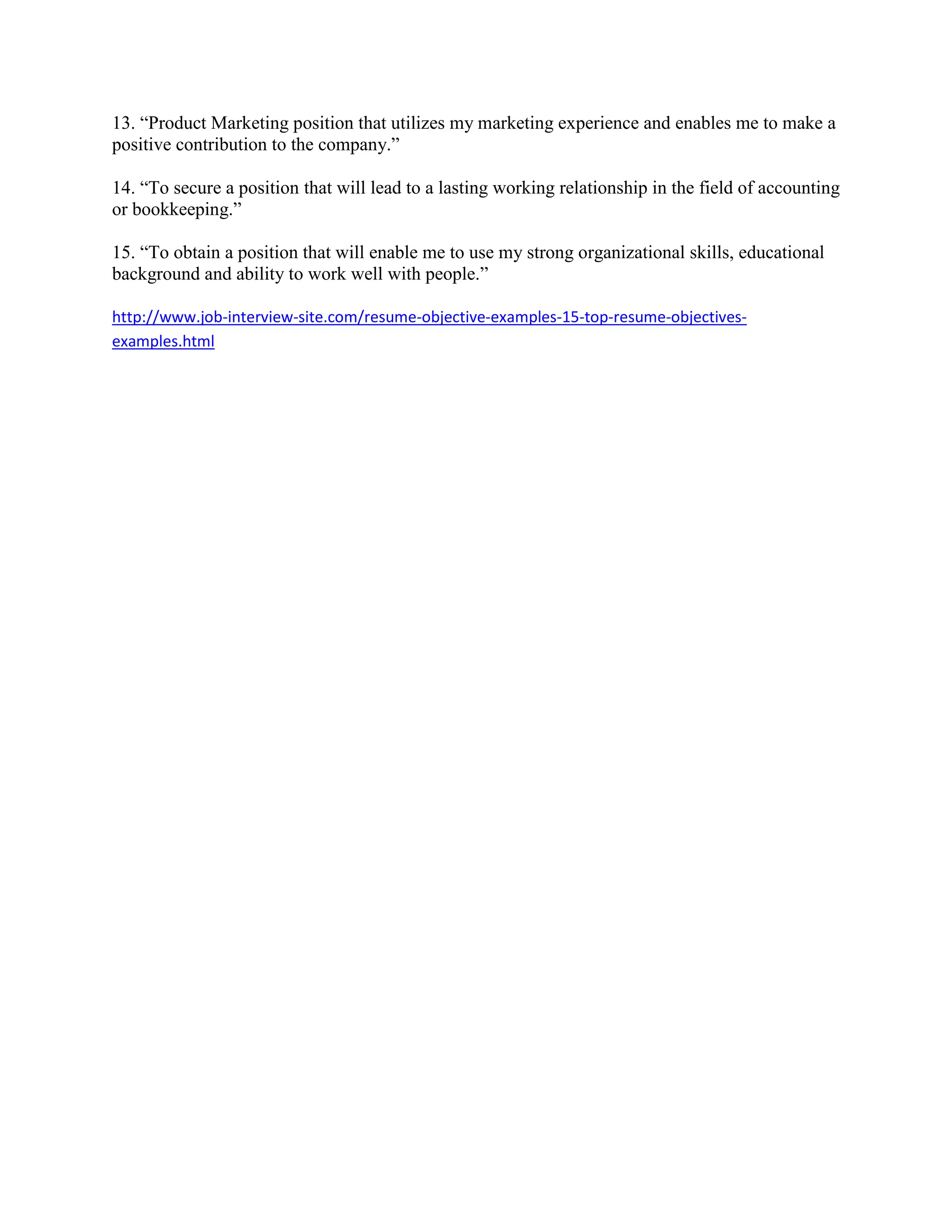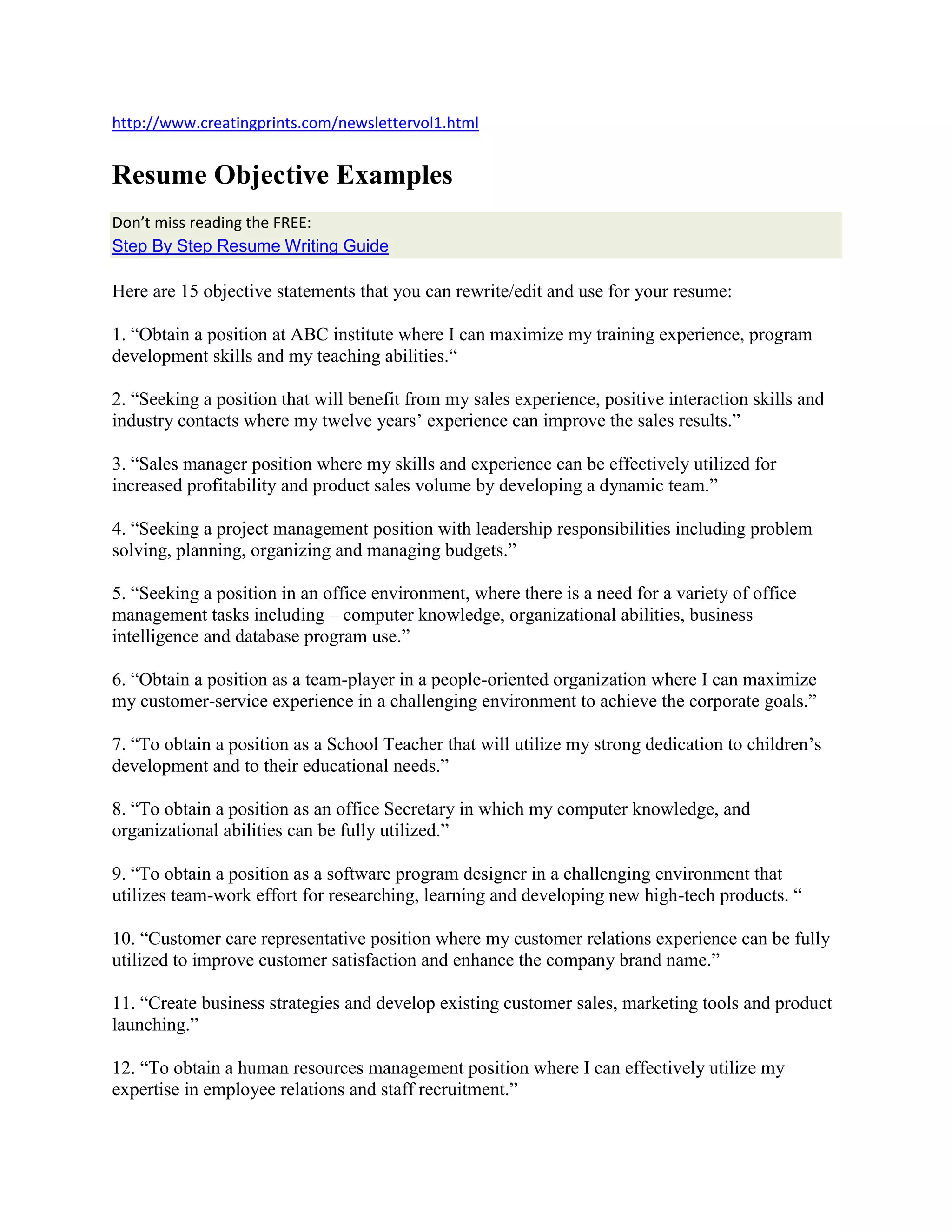 The document provides 15 resume objective statement examples that job seekers can edit and use for their own resumes. The objective statements cover a wide range of career fields such as teaching, sales, project management, office administration, customer service, software development, human resources, marketing, accounting, and general career objectives. Users are encouraged to rewrite and customize the statements to highlight their relevant skills, experience, and goals for a particular position or industry.