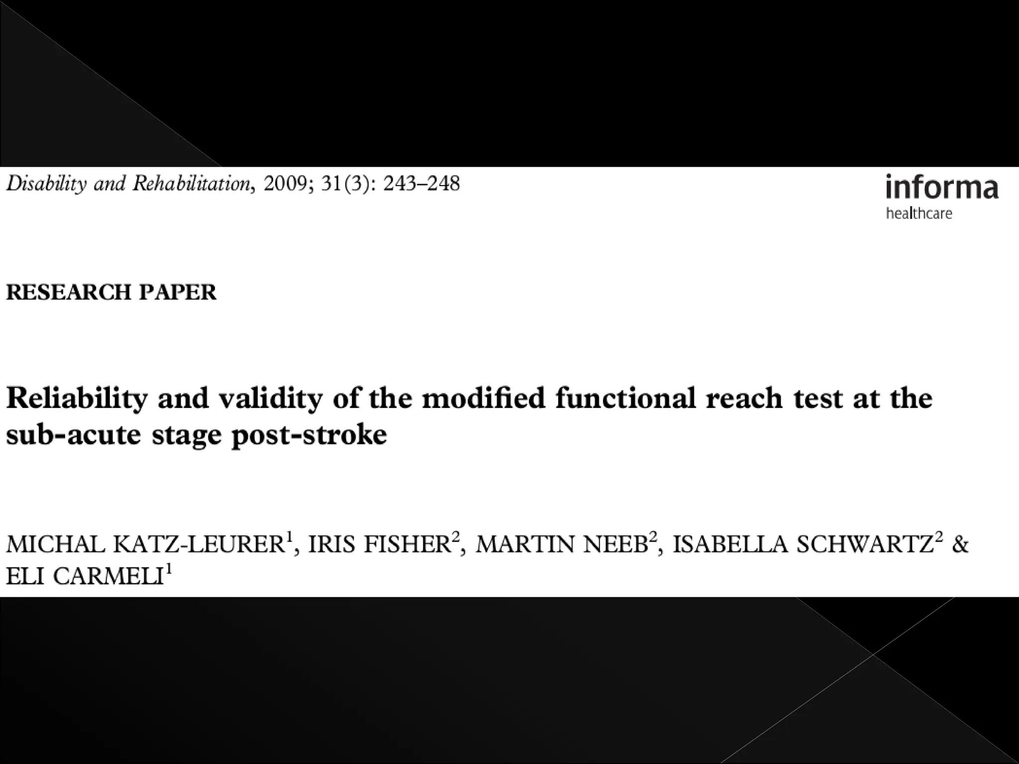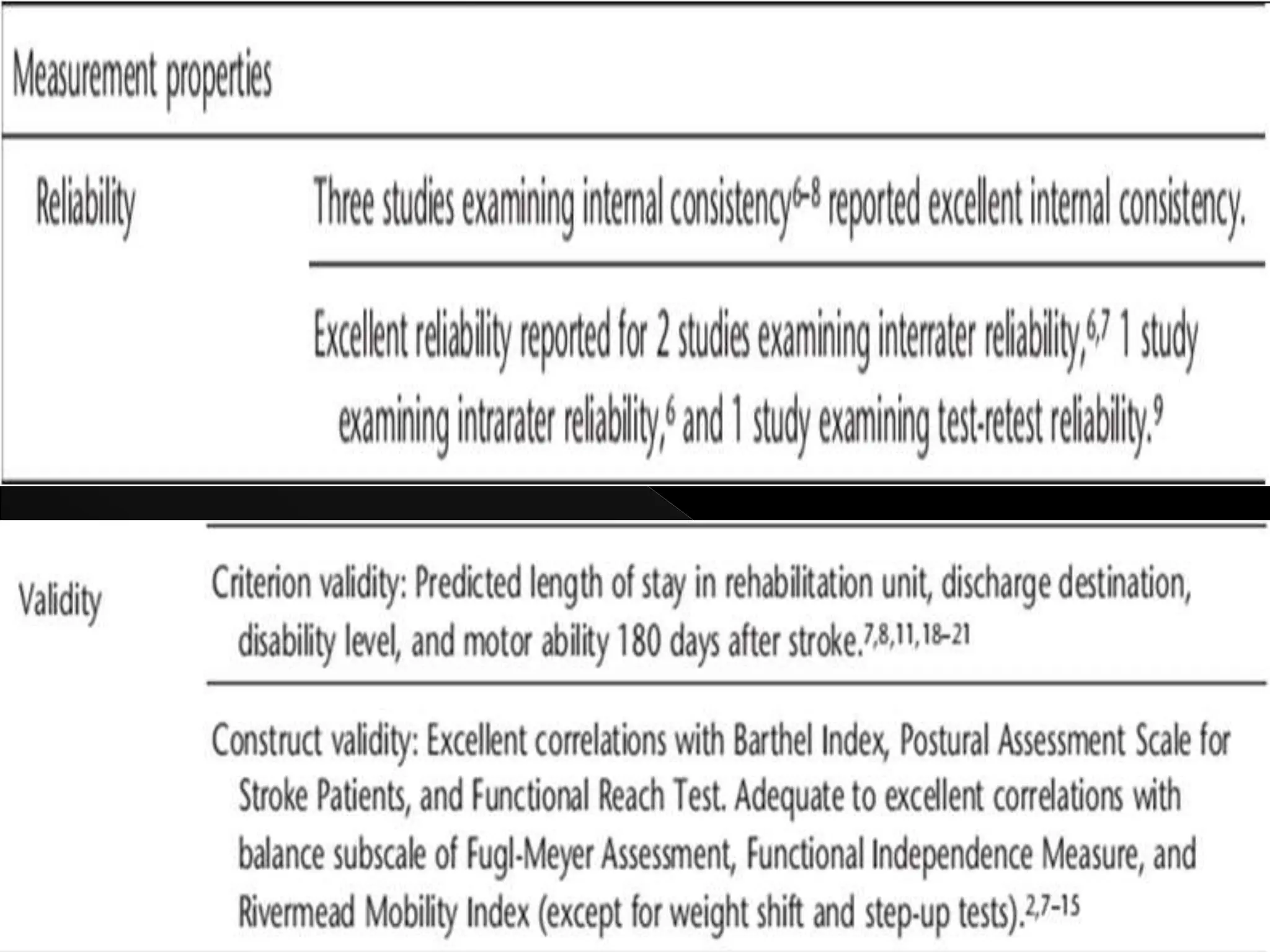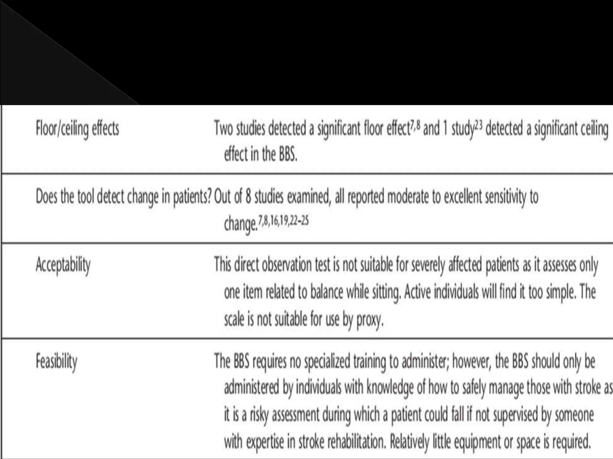 The document reviews various psychometric properties of different balance assessment scales, including the ABC scale, BBS, and modified functional reach test (MFRT), focusing on their reliability, validity, and responsiveness for stroke rehabilitation. It highlights findings from multiple studies indicating that while some scales show ceiling and flooring effects, the summary scores of certain assessments do not, allowing for meaningful evaluation of walking-related tasks. The document concludes that the BBS and MFRT are sensitive to balance declines post-stroke, with recommendations for using shorter assessments where time efficiency is critical.