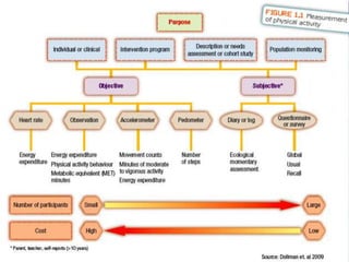 Objective measures of physical activity include heart rate telemetry, accelerometers, pedometers, and direct observation. Heart rate telemetry uses a watch to measure heart rate during exercise to estimate energy expenditure. Accelerometers provide detailed information on frequency, duration, and intensity of activity. Pedometers count steps to measure distance walked. Direct observation is the most accurate but least practical as it involves directly observing and recording a person's physical activity. These objective measures are used to evaluate physical activity guidelines, health relationships, and the effectiveness of interventions.