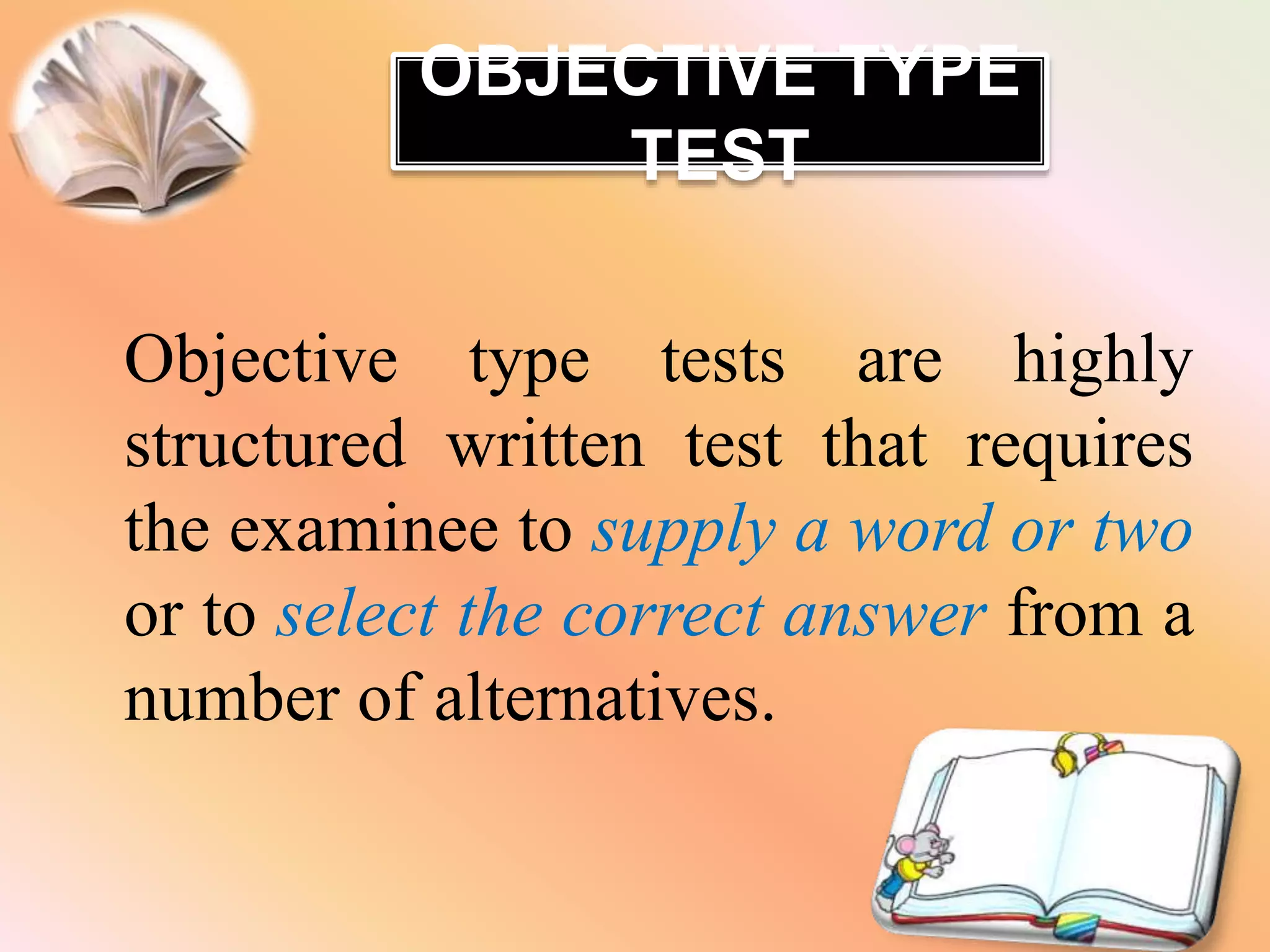 This document provides information about objective type tests, including definitions, classifications, and guidelines for creating different types of objective test items. It defines objective tests as those with predetermined correct answers that can be scored objectively. Objective tests are classified as supply/recall type, selection/recognition type, and matching type. The document provides examples and creation guidelines for true/false, multiple choice, completion, and matching items. It discusses measuring various levels of learning and outlines principles for preparing objective tests, such as ensuring all content is covered and maintaining confidentiality.